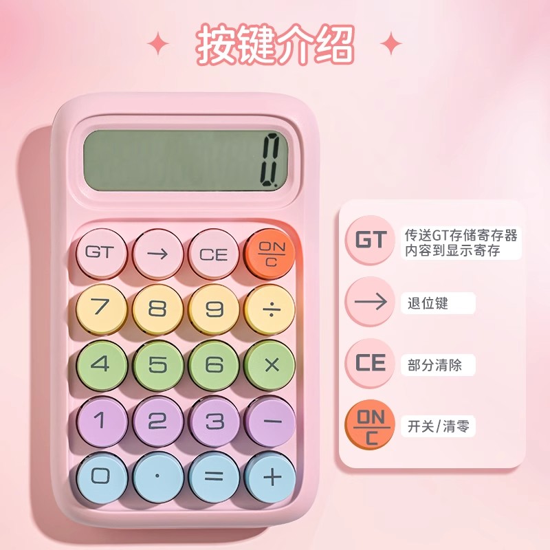 以马卡龙多巴胺色系勾勒出时尚可爱的吸睛外观,契合当下审美偏好;配备柔性静音按键,按压轻盈顺滑且操作静音,适配办公对账、自习演算等安静场景;集成加减乘除、记忆存储、百分比计算等基础运算功能,覆盖职场财务与校园学习需求;加之身形迷你可轻松收纳于笔袋、背包,真正实现颜值与实用兼具,随时随地满足计算诉求 。