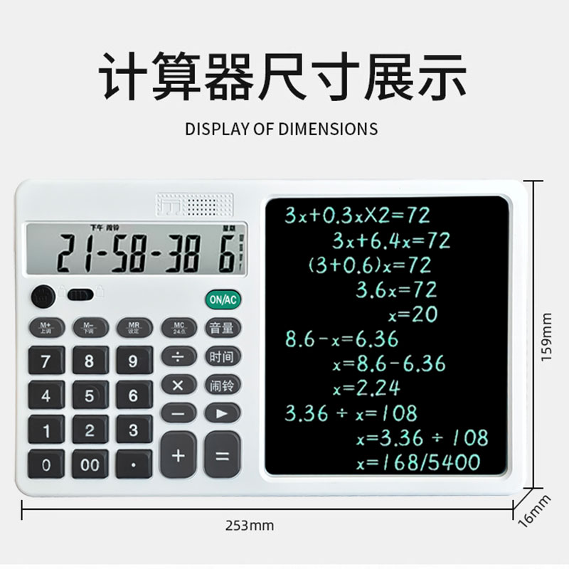 这款双屏计算器堪称 办公「灵感连体舱」 :灰白机身如职场隐形战甲,左屏化作数字引擎,敲键间报表累加、公式运算秒出结果;右屏电子手写板是流动灵感画布,会议闪念、刷题推导随手涂写,清屏键一按便归零重生 。更藏闹铃彩蛋,算着数突然 “叮” 响,催你奔赴会议场 。职场算预算、学生解真题、家庭理收支,全场景包揽 “计算 + 记录”,让便签从此下岗,数据与灵感在双屏间同框共舞 。